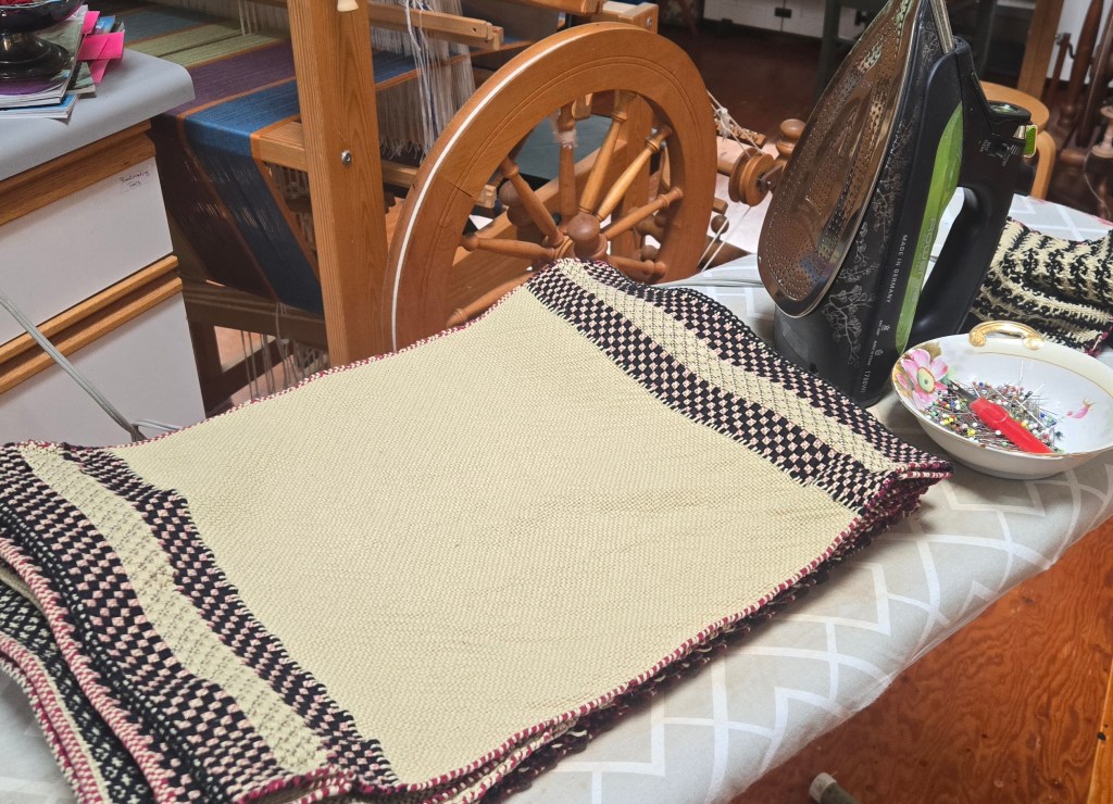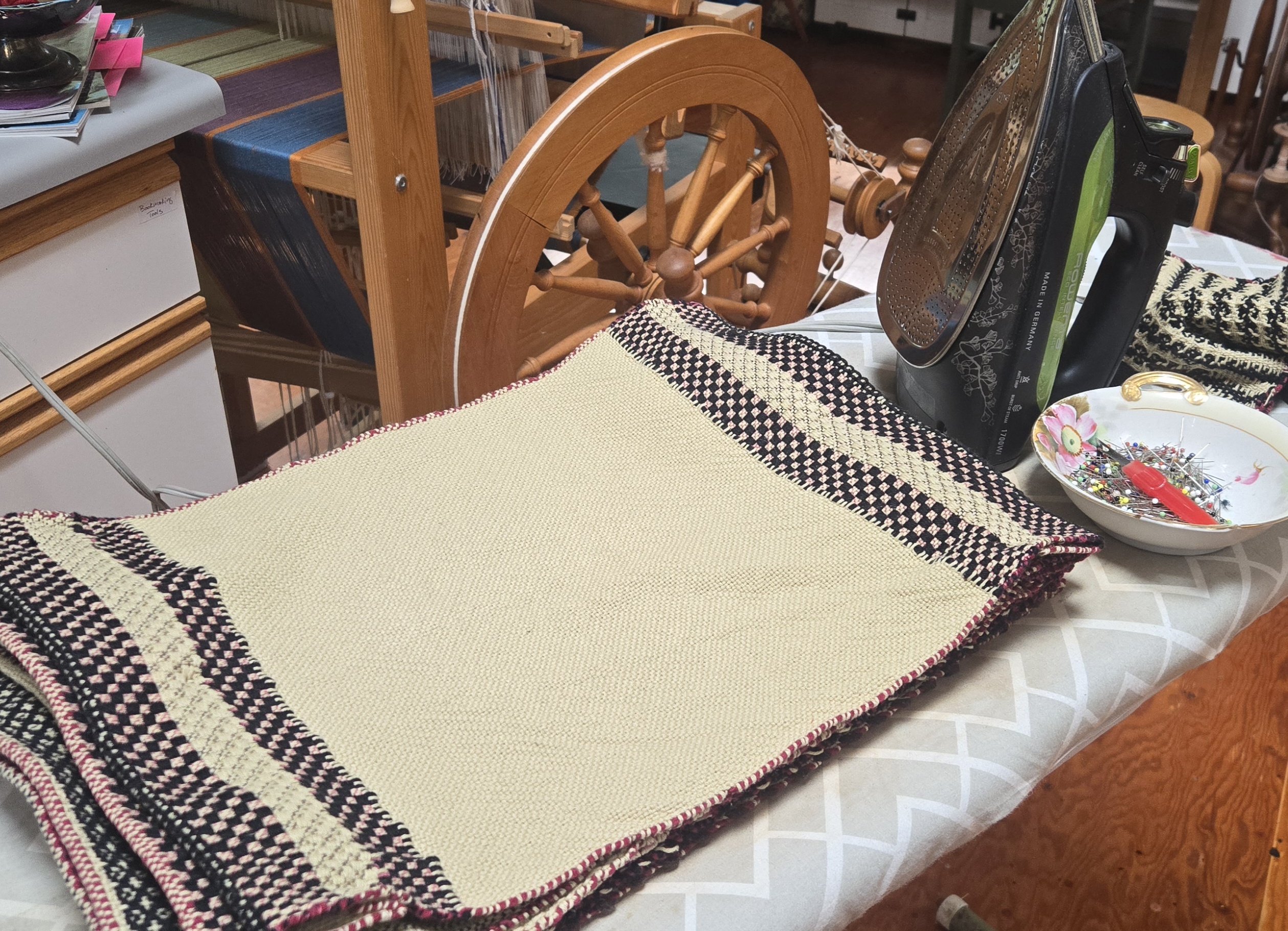 22/100 | March 15, 2026: Weaving-related item of the day is the cutting, ironing, and hem-pinning on the collection of placemats I wove last week. I will hand hem these at a rate of about one per day.