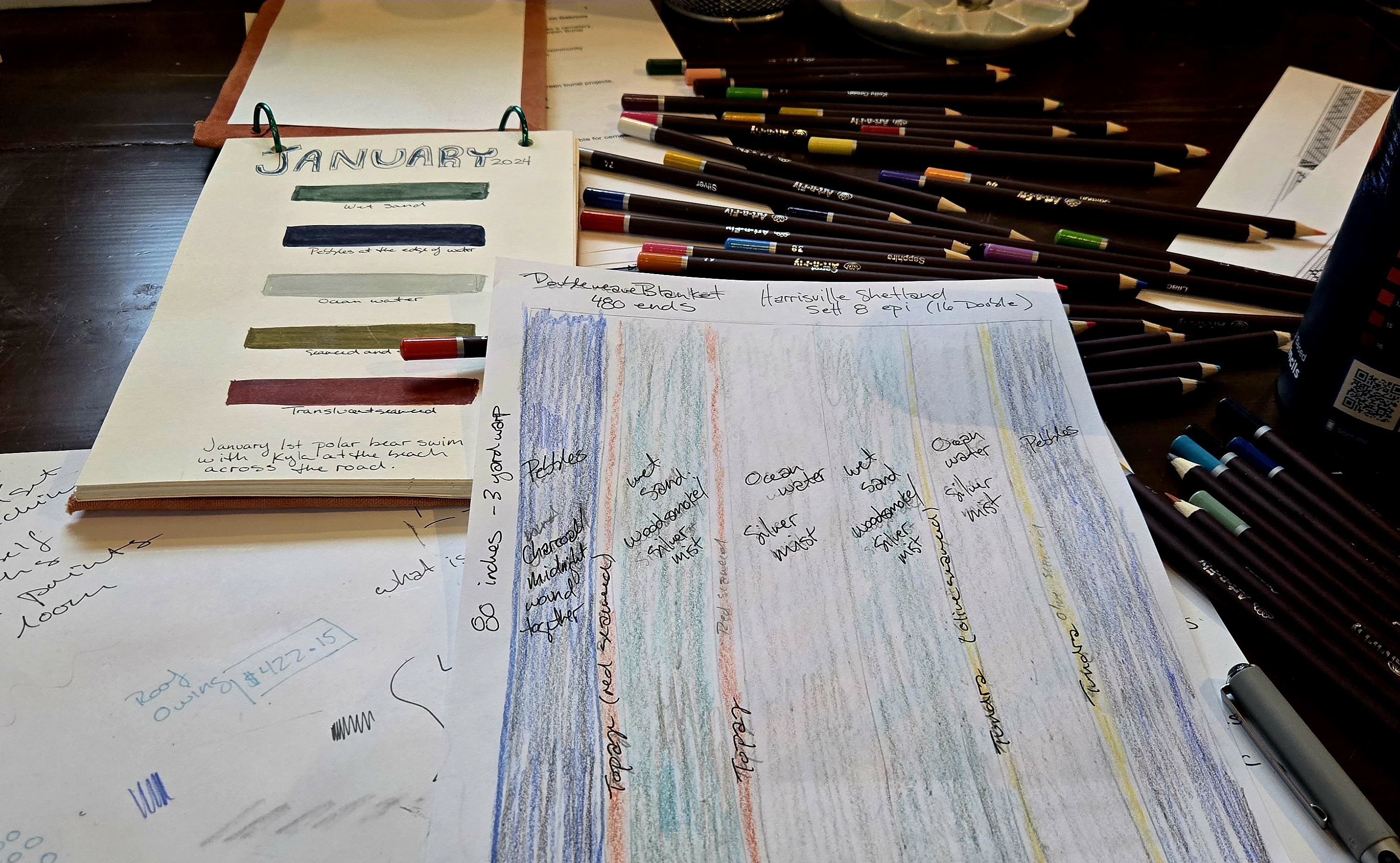 23/100 | March 16, 2026: Doing a bit of design work. I’ve been itching to weave a 60-inch wide blanket in doubleweave and now I’ve mapped out my plan using an oceanside colour palette I collected 2 years ago.