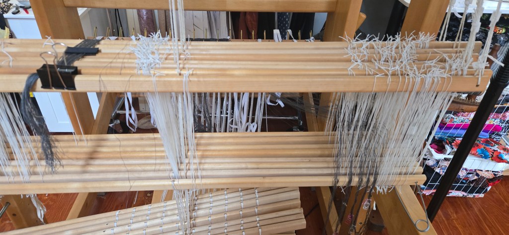 24 and 25 | 100, March 17 and 18 2026: I started threading, discovered a mistake in my heddle management, and had to unthread and start over. This is a fine linen warp which I am putting on in a sample quantity to see if I want to work with fine threads, and what kind of fabric this weight of thread (plus silk) will make.