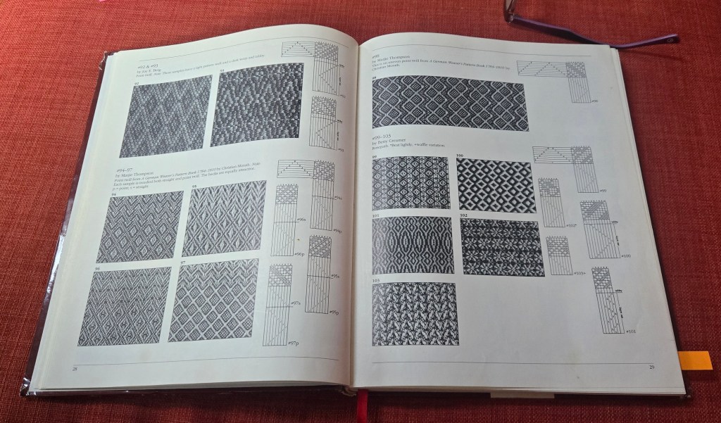 21/100 | March 14, 2026: Thinking about what to put on the loom next, working only from my stash. I’ve got some linen and silk here and I’m going to create some samples threaded in setts of both 24 and 30 using a point twill pattern and various tie-ups.