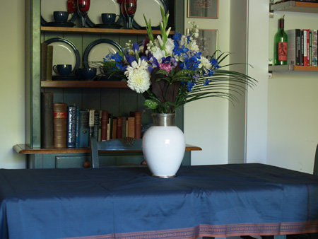 And to top it off, today I went to the Napier block yard sale and bought tons of books (for only 50 cents each), some odd pottery bowls for ice cream, and two beautiful pieces of sari fabric from the Fijian mandir on the corner (only $5 for each piece of pure silk). After coming home I scrubbed the apartment down (moved furniture and washed the floors even) and then cut one of the fabric pieces for a new tablecloth – finishing the living room off which some pricey but gorgeous flowers. My space feels good, clean, aired out, and just exactly what home is to me.