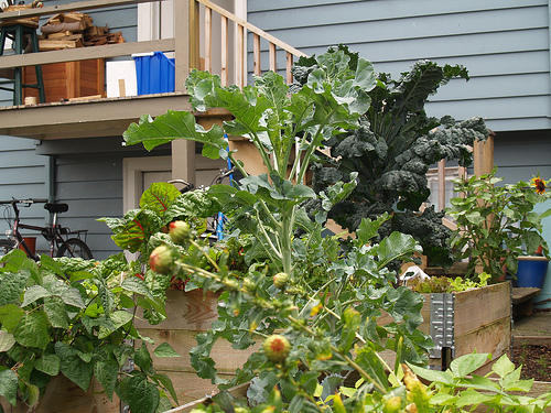 This is the view to the right of my garden bench at the moment: safflower at the end of its bloom (which I pulled off for eating), a late sprouting broccoli and a tree of kale. No kidding, it’s got a trunk at least 2 inches in diameter now! I think it’s probably time for some serious harvesting and green-drying. Or, I could use my friend Kyla’s trick of turning all greens into pesto for freezing. Handful of greens, some garlic and oil and basil (or mint) and you’ve got instant nutrition by the spoonful in any soup or stew or pasta sauce.
