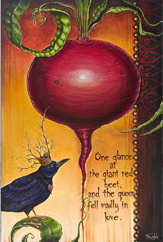 Really, I’m no art critic, but the moment I saw the painting above in Trumbly’s Etsy shop – “The Queen and The Beet” – I wanted a print of it for our backyard studio. Not only because it features a crow (endemic to East Vancouver!), and not only because my nickname for Brian is “Beet” – making it the perfect romantical gift – but because it somehow is so evocative of the earth/garden love that I want to infuse our home all the time. As are all her works…. deeply loving of the natural world.