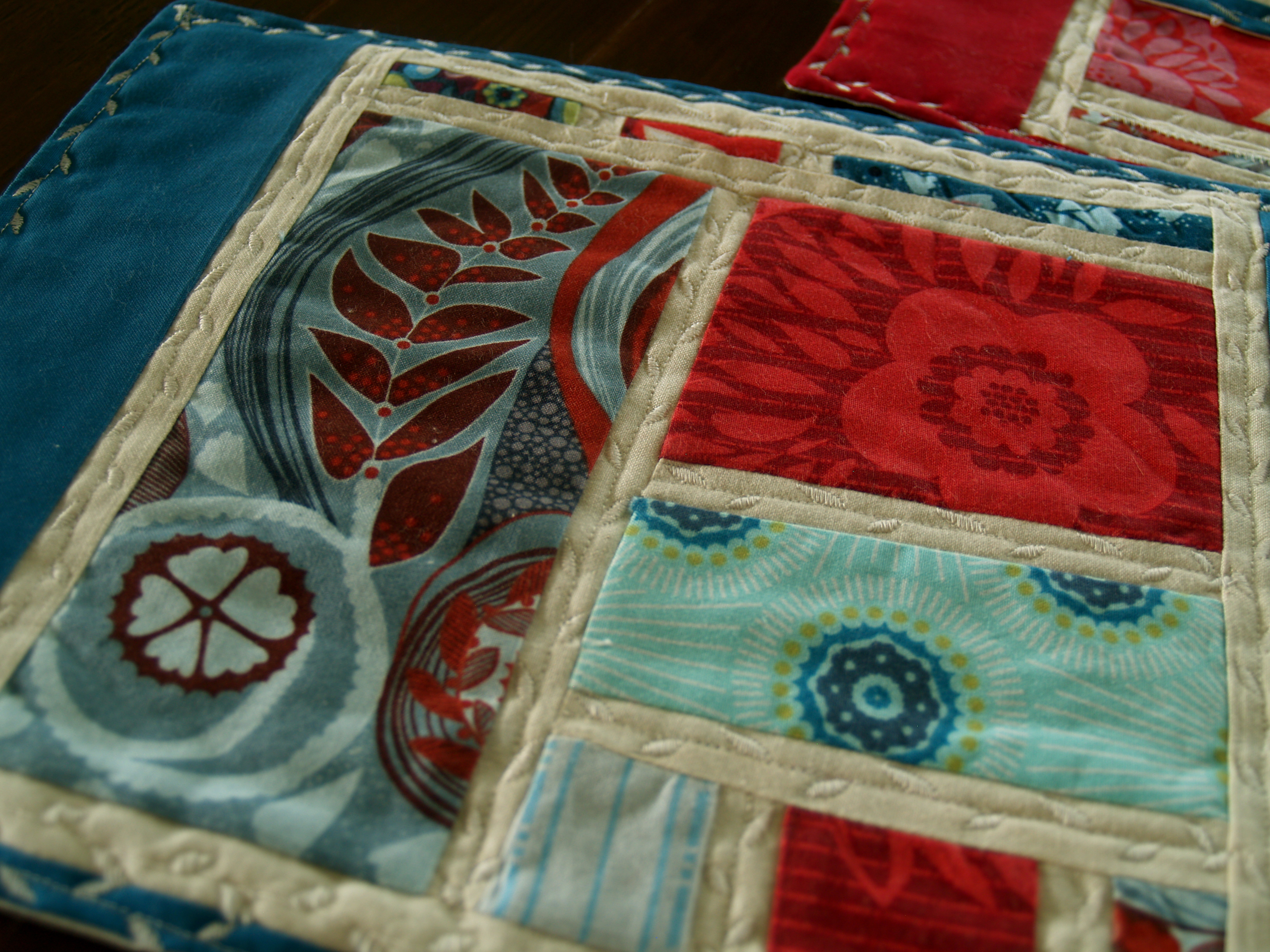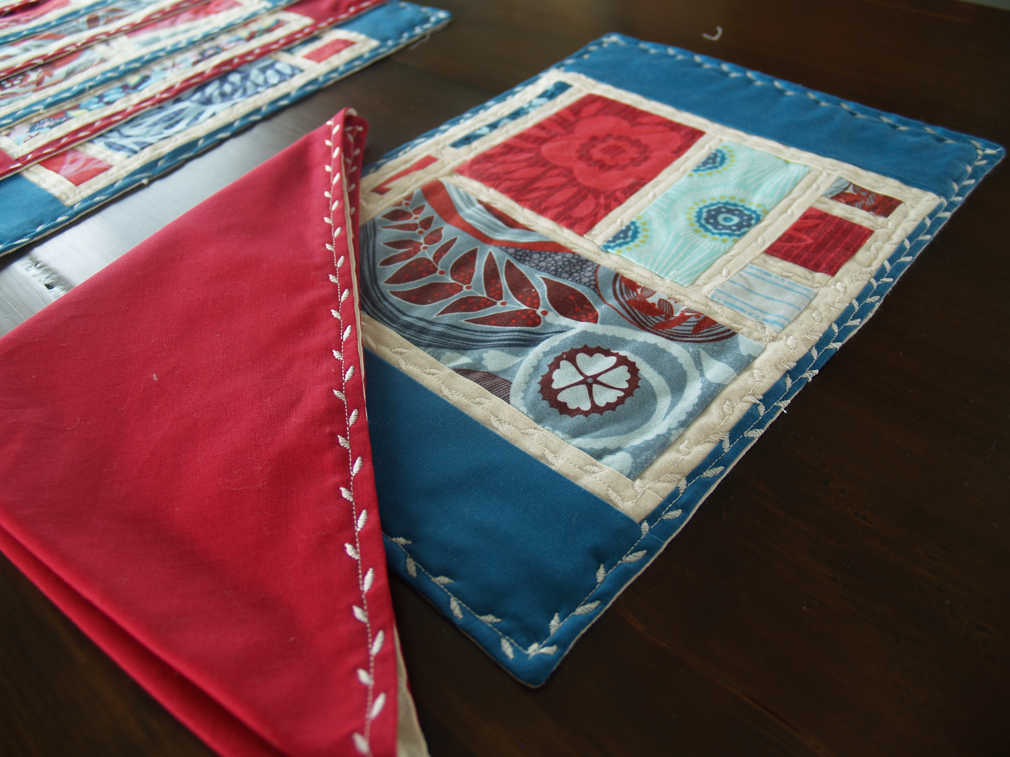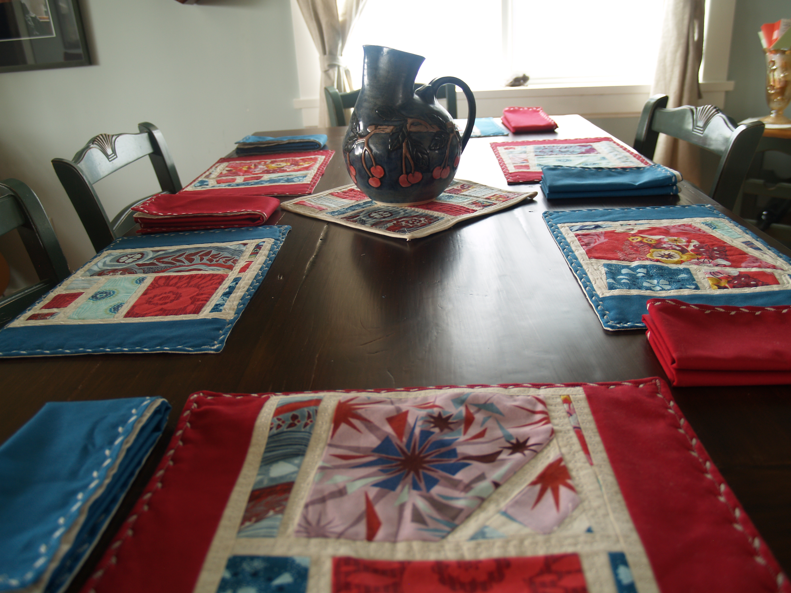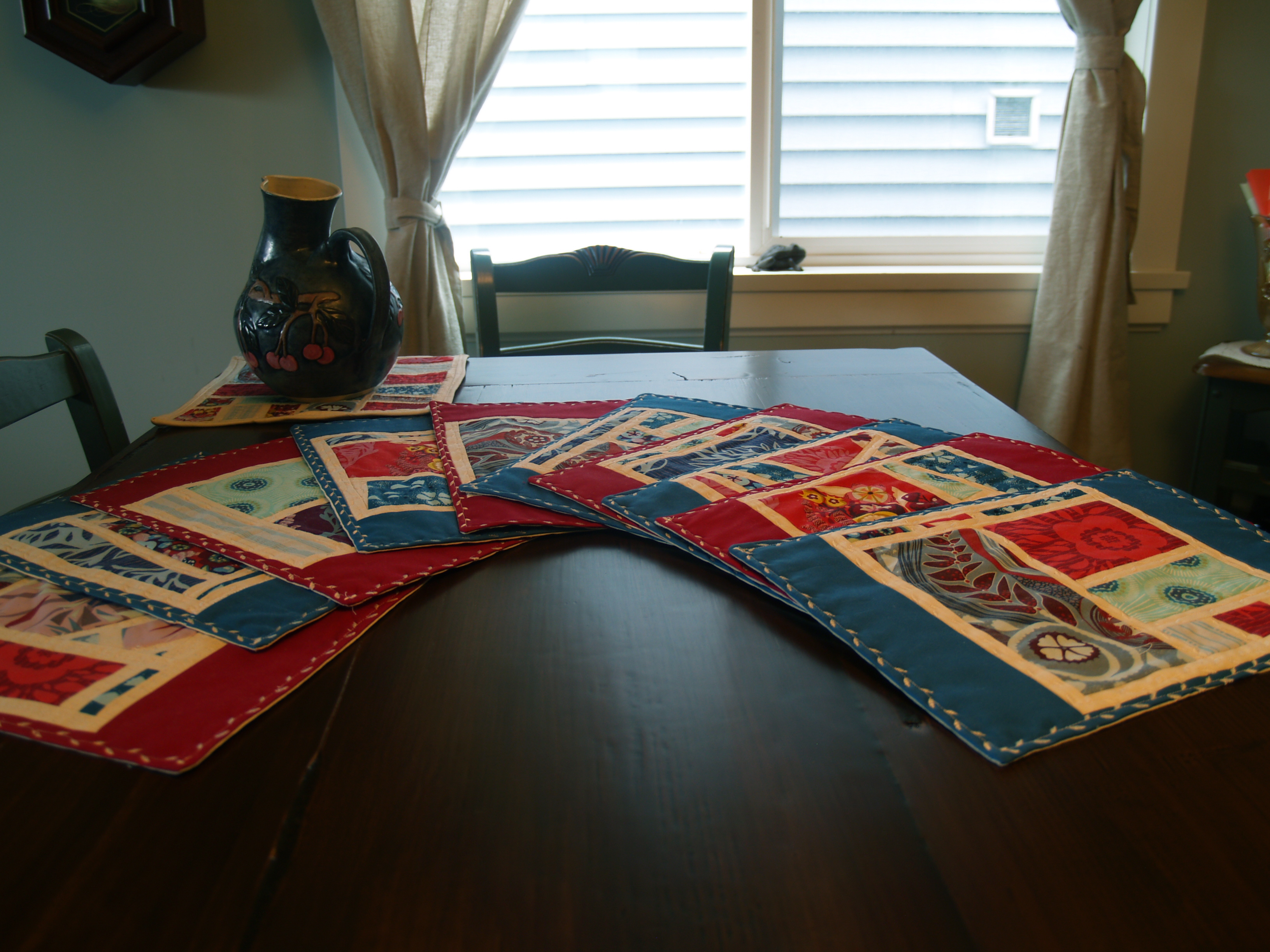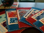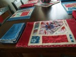 This may seem excessive, but after 20 hours working on these placemats and napkins I feel that I have earned some bragging rights. Thus, a gallery showcasing the ten placemats and napkins (plus trivet) I put together in honour of Brian’s birthday and because we didn’t have a single set of linens for the ten people our new table seats.