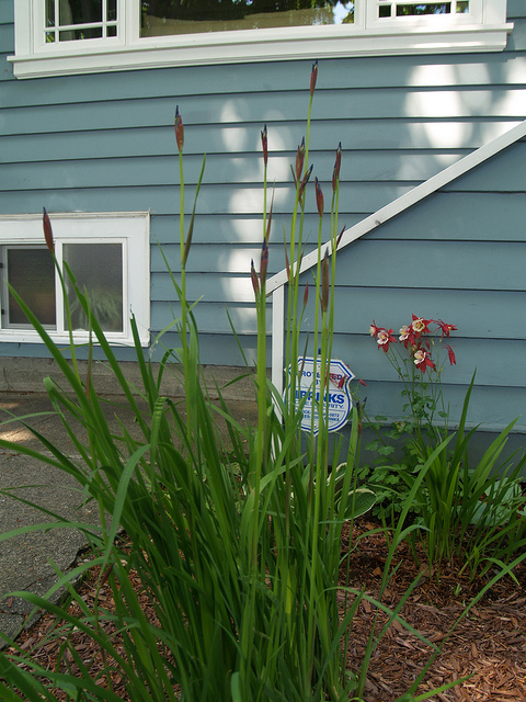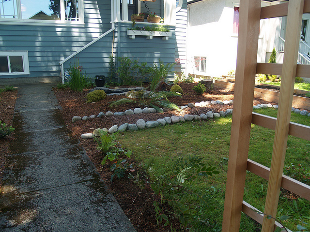 Since then, we have intermittently worked at our little front patch (which has grown increasingly shady under the leafing beech trees) and finally have about half of it mulched and planted. This is about as far as we are going to get it this year I believe – due to the timing of the year and also the cost of putting in more plants. I would rather wait until next year when I can divide some of our shade-loving perennials rather than shelling out a ton of more money at the garden centre. Also, I’m waiting to see how the wild dug oregon grape and sword ferns do – as I have access to many more on my parents’ property and will install them if they seem to like the locale.
