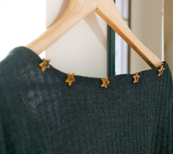 Here is the latest of my sewing endeavours – a first experiment with knit fabrics in the form of a charcoal rib-knit that I got at DressSew for $6 per metre. Unfortunately I have a tendency to make things too large – it has something to do with where my measurements sit in the middle of two pattern sizes – I always choose the larger when I should probably choose the smaller. But I really hate the idea of things being too small -so instead they come out too big. On the other hand, a slouchy tunic is a nice thing to have in a wardrobe so I’m not complaining too much about this one. My favourite detail about the whole thing? I got to use some ceramic star buttons that Brian bought me last year at a community craft sale.