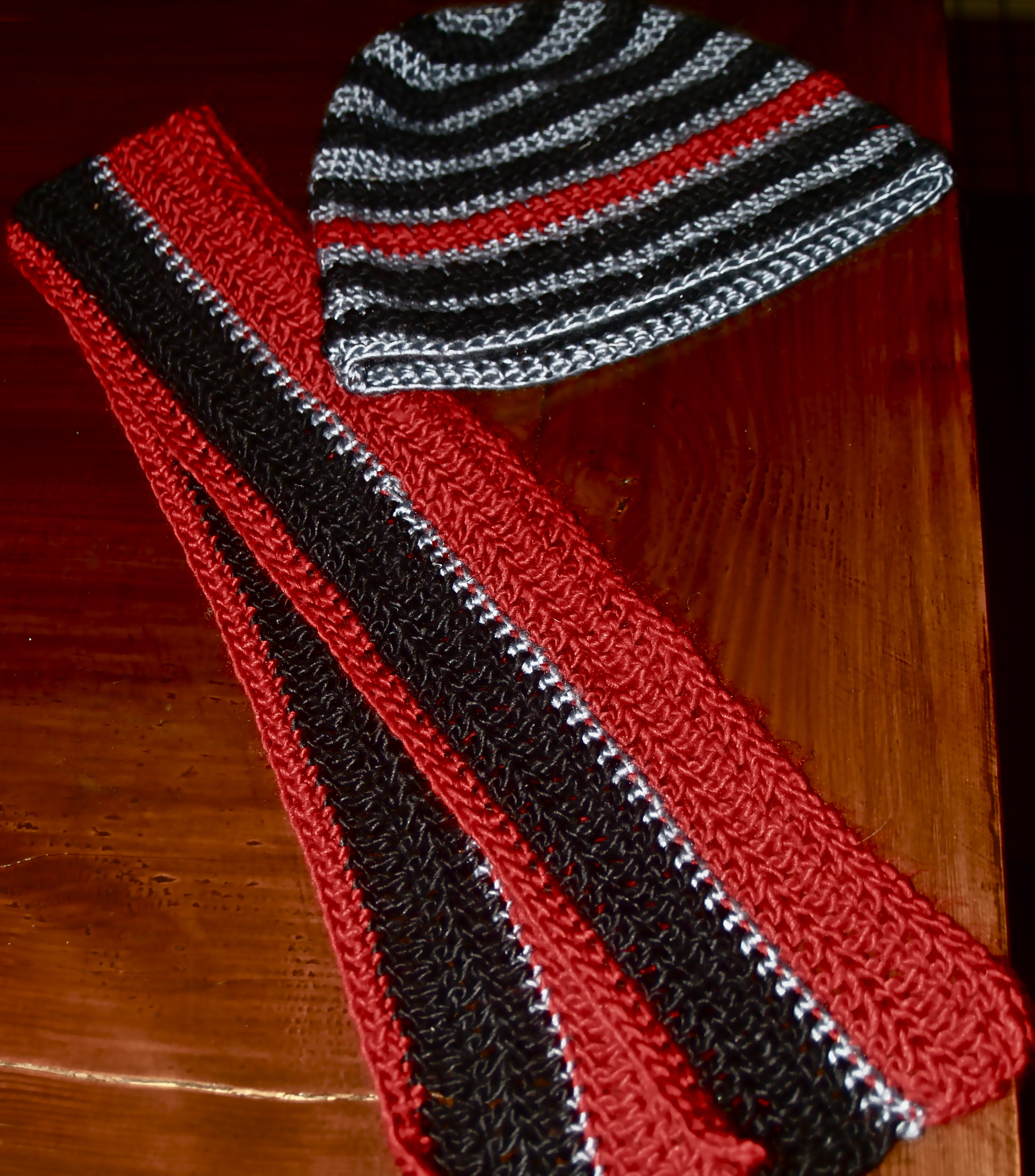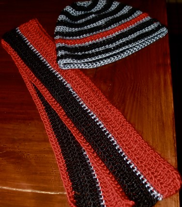 One of these days I am going to figure out how to photograph my stuff better…. These look much nicer (not so bright, and not so shiny) in real life. Finished this evening to be put in the mail to a friend tomorrow. A return on a favour she did for me early this fall and also because she rocks. Like the last toque and scarf set I made – this is Mulberry Wool/Silk blend and it’s not only super-soft but really warm. Which is good because this set is going to Ottawa where it gets real cold.