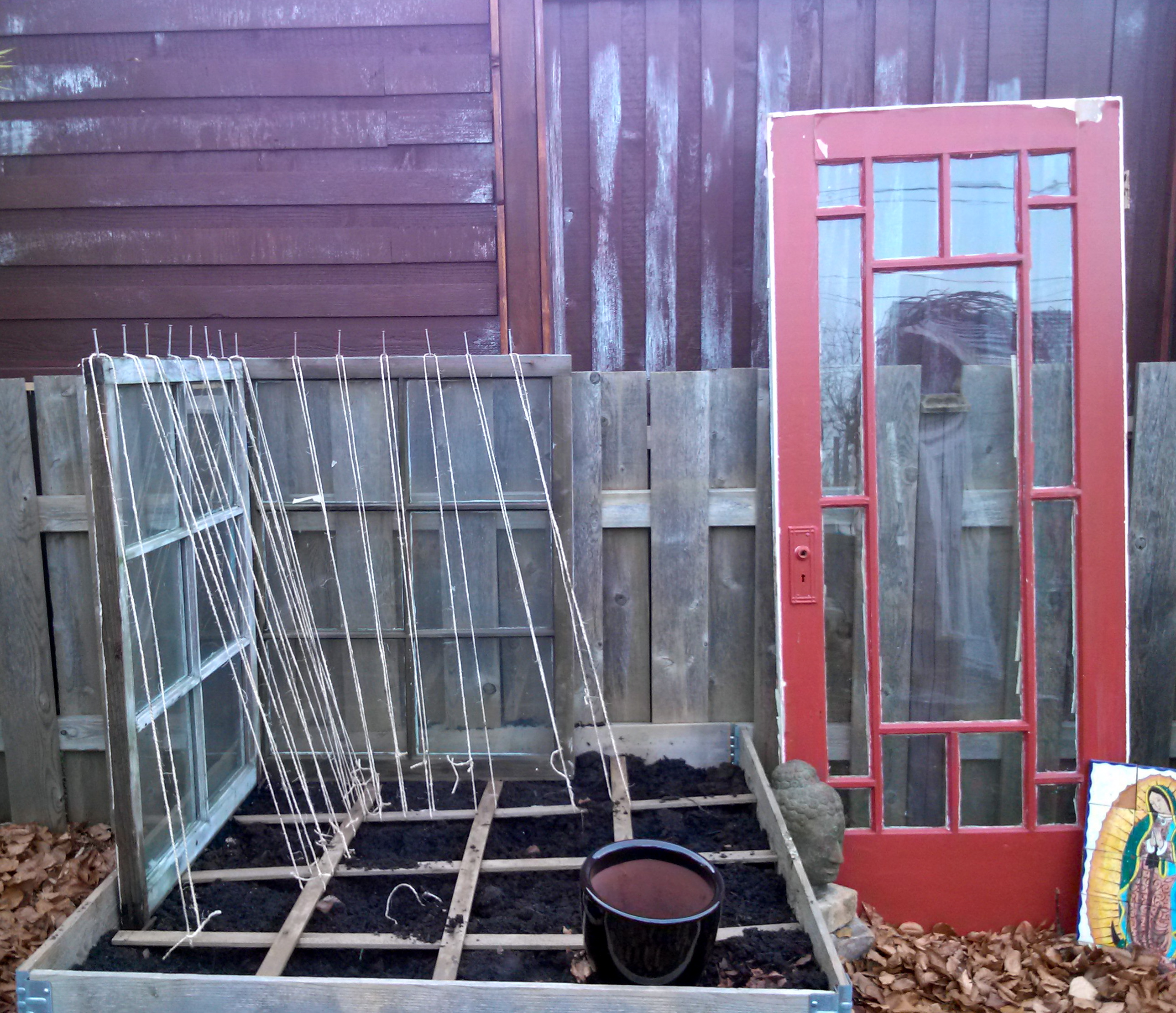 To my door for vertical planting, I have added two windows, fished out from behind our garden bench where I stashed them ages ago after they were removed from our house. Purpose? A new pea trellis! And possibly a cucumber trellis after peas are done. I topped up the bed today also with compost and mushroom manure since this bed is a tad shady in the spring and I want to give those peas all the help they can get.