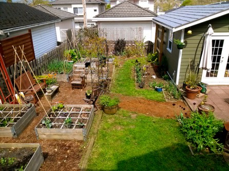So instead of mustering up my writing energy I am simply going to post a couple yard photos. The backyard, which I got all cleaned up yesterday, with bean poles installed (and beans planted), lawn mowed and edged with the weedwhacker, mulched areas weeded, patio swept: