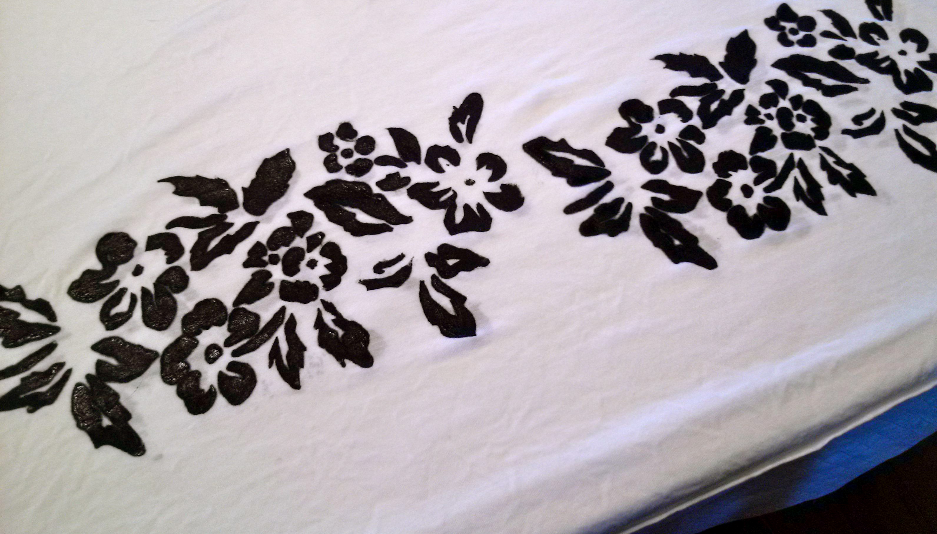 First the dreaming. Then the learning. Here is my first stencil – cut and inked three times on some hemp-rayon jersey that arrived in the mail today. It’s my practice fabric but I’m hoping I can do some stencil layers and turn this into a scarf…..