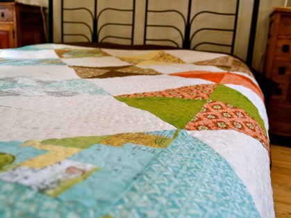 Finally! I have been itching to show off this quilt for the last week and a half since I finished it, but because it was an un-wedding present for two of our closest friends I was worried that to parade it online would spoil the surprise. In any case, here it is – and almost queen-sized quilt made from two layer cakes (pre-cut fabric squares of 10-inches apiece) reconstituted into triangles and then sewn into a diamond pattern. Fabric is Curio by Basic Grey for Moda with Bella Solids “Natural” shade.