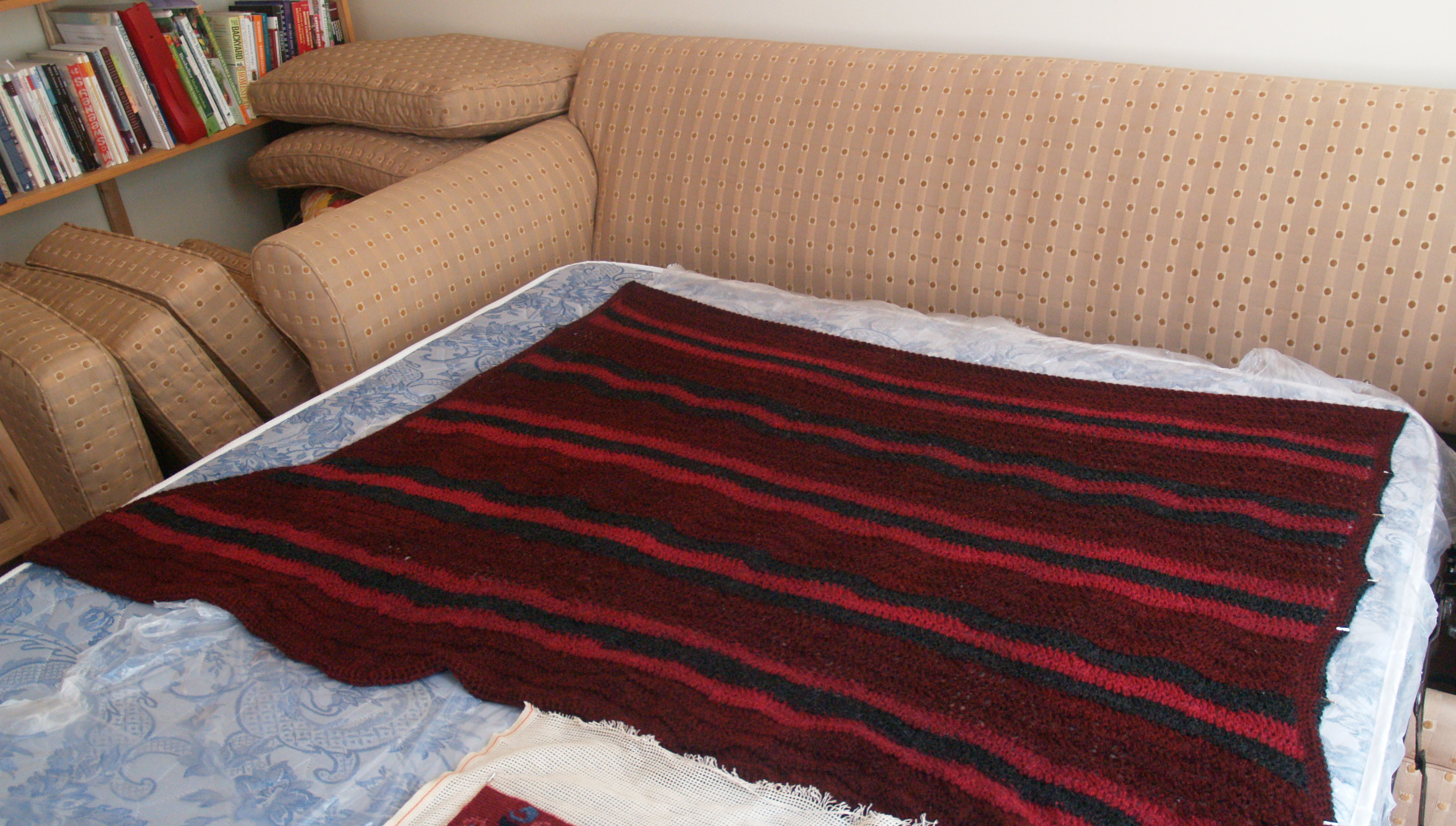 I managed to set two of my pieces up for blocking today – an odd-shaped afghan and a piece of needlework/tapestry that I started about seven years ago. (Blocking is the act shaping your work once it’s been washed and is part of “finishing”). In the case of my tapestry piece, years of working on this canvas and transporting it around left it a bit skewed – so blocking was really essential to getting it back into shape. With the afghan, I’m not sure it’s so important because it’s just a lap-quilt anyhow, and it turned out to be a bit of a hot mess of pattern problems (which I won’t go into here).