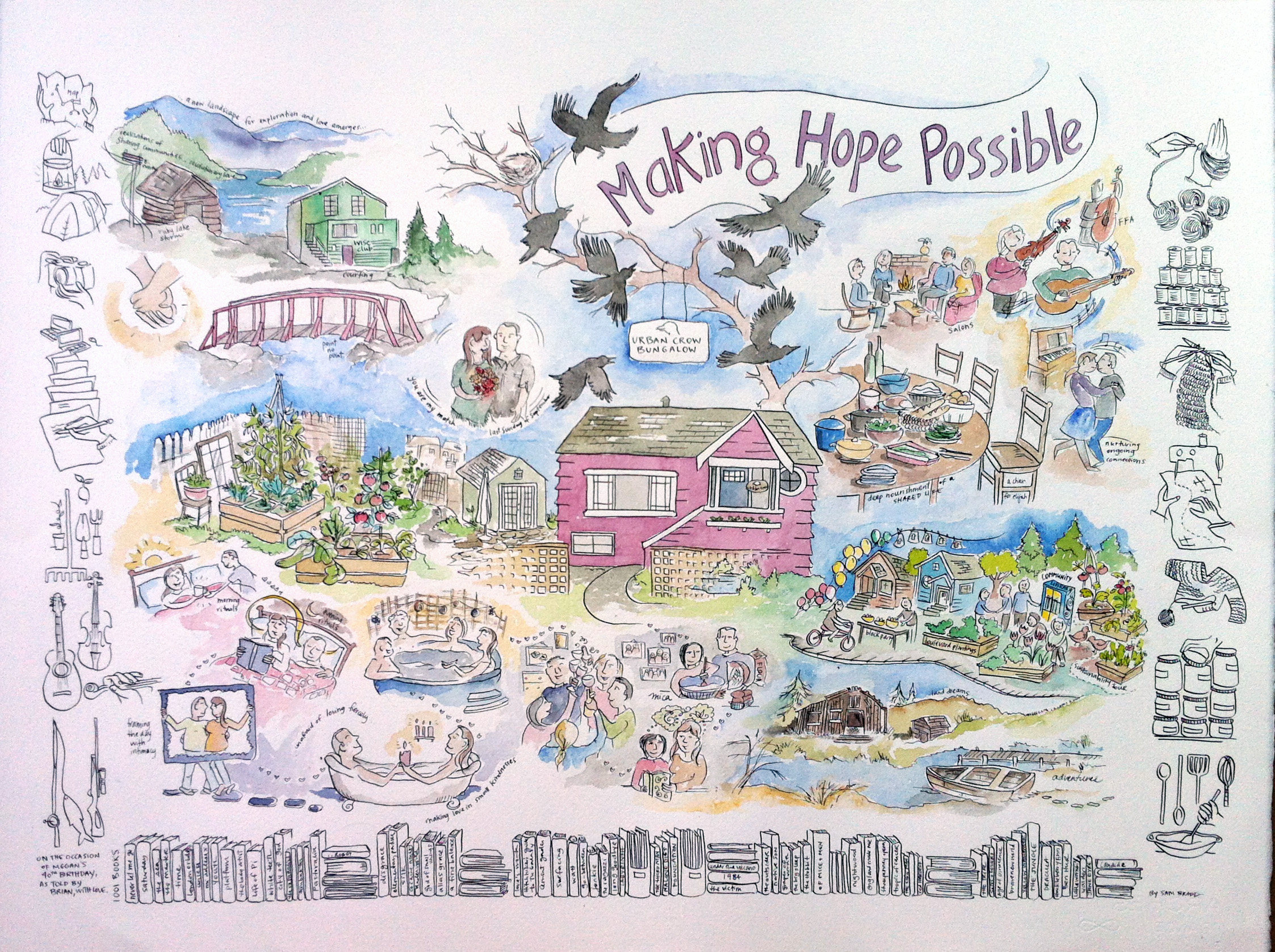 If all of philosophy really is the question of what it means to have a “good” life, then I think I am getting closer to the answer every day. And on Friday night I was presented with my answer (the one that Brian and I have come up with anyways) in pictorial form. For my fortieth birthday gift (which I received early during our cabaret on Friday night), my dear B. commissioned a piece of artwork from our friend Sam Bradd to encapsulate just what it is that makes our life together so incredible.