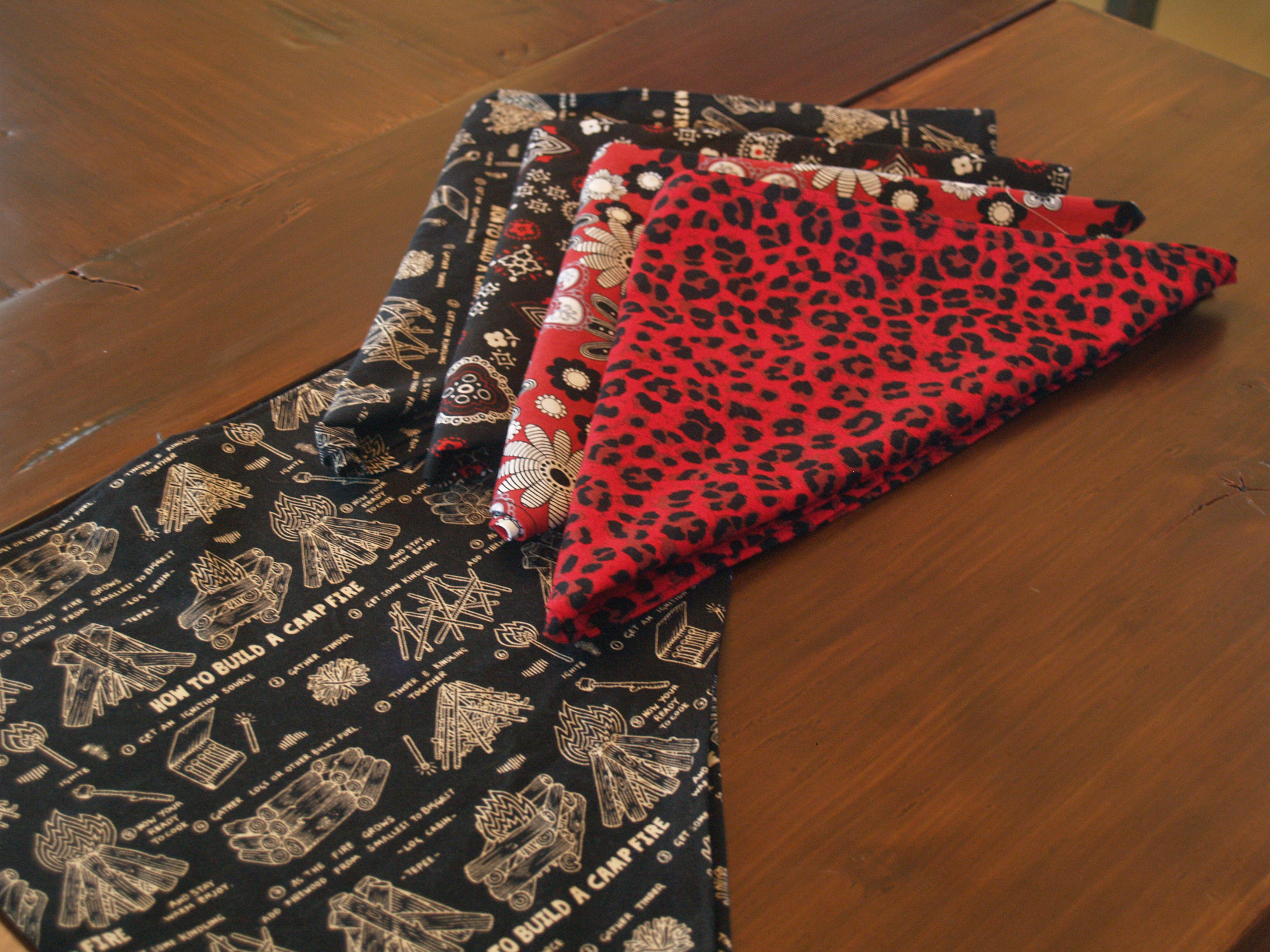Since my much-beloved ‘kerchief has pretty much become a rag over the past few years – I figured it was time for some new ones. Talk about a low-barrier, quick gratification project! With just 2.5 metres of fabric (bought in 1/2 metre increments) I now possess a bevvy of bandanas! (Two of them are going to Brian and Mica – but that still leaves three for me.)