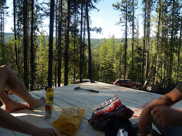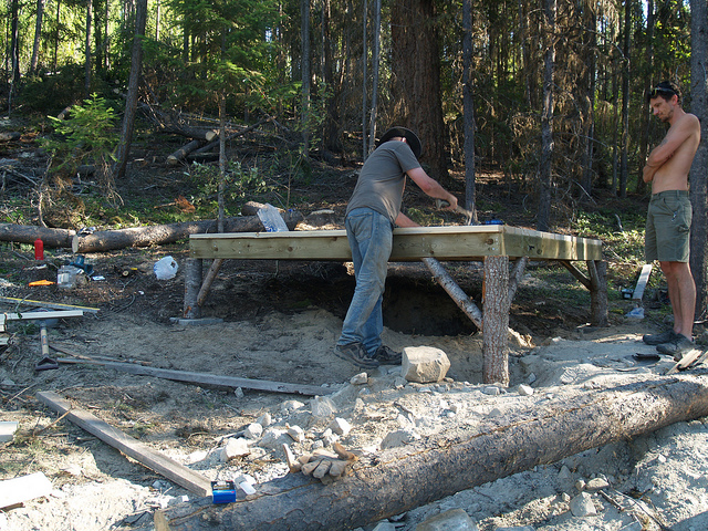 After the platform was finished, Brian and Will selected logs to make the outhouse structure from. Obviously 8×8 is way too big for an outhouse, so we determined that the structure would be comprised of an enclosed outhouse, with a washing area outside, and a rainwater collection system to the side of it. I left at this point to go to Keremeos and buy fruit.