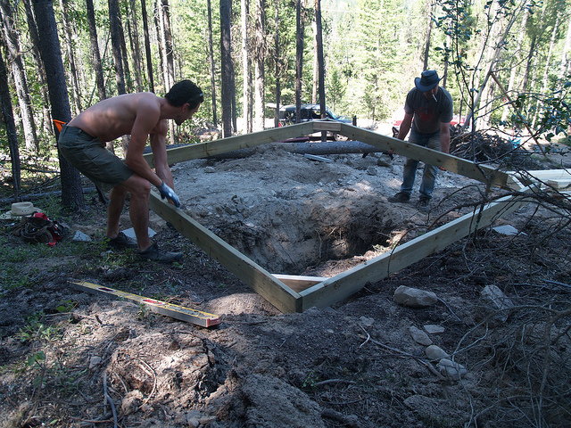 And so, having waxed rhapsodic for a moment – I bring you some pictures of our very first (and most urgent) building: The OUTHOUSE (not yet finished but we got a good start on it).