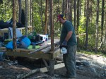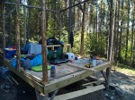 The outhouse platform is currently doing triple duty as sleeping, cooking and work space.