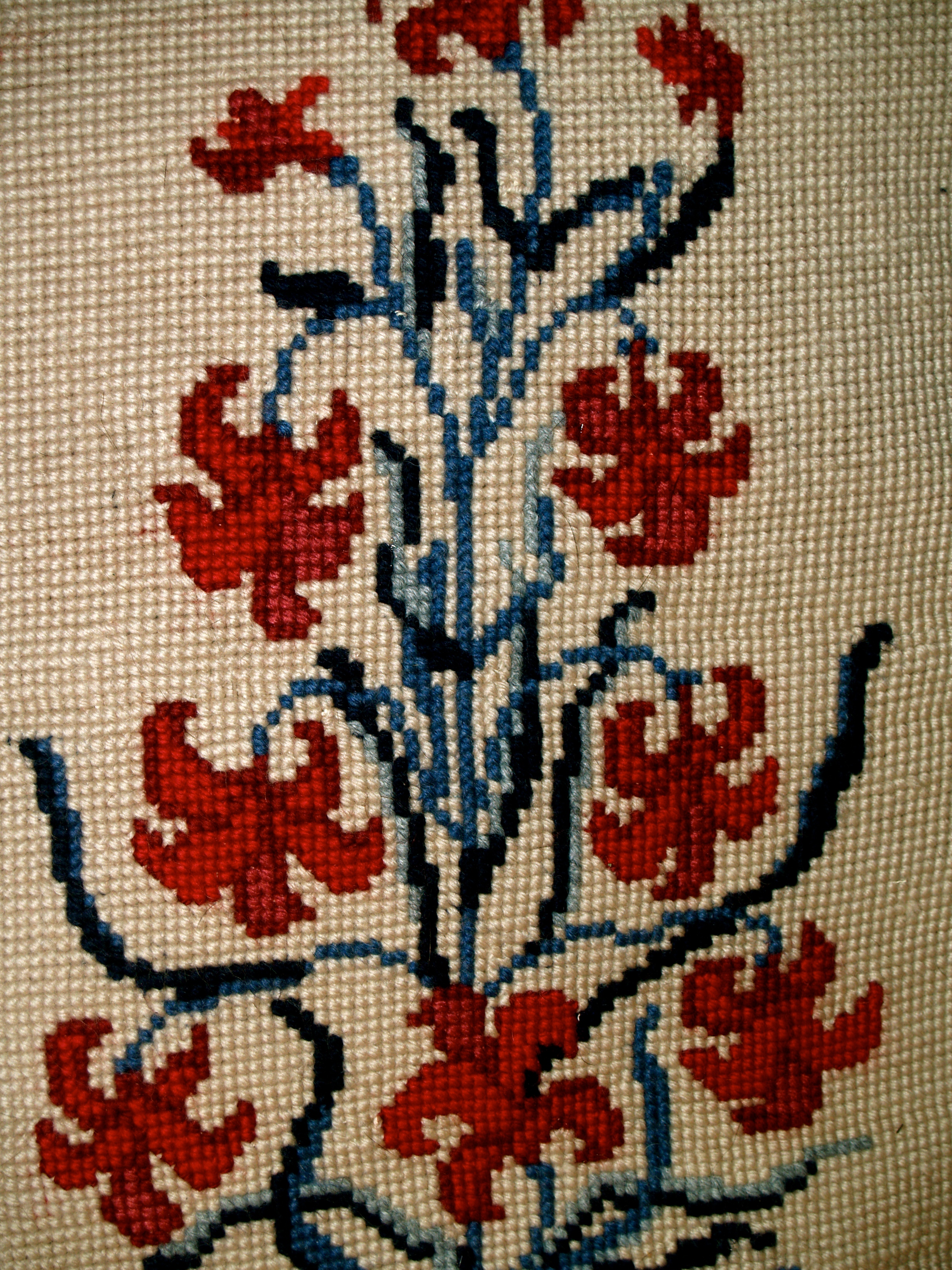 It strikes me odd that I have never shared this project here – especially given its long history. Started over seven years ago, in my last months of living on the Sunshine Coast, this is a project from my ferry-commuting days – a cross-stitched top for a pillow. Taken from a book of India-inspired stitching designs, I modded the project for the larger canvas and worsted wool yarn – and had most of the main pattern done when I moved back to Vancouver in 2006.