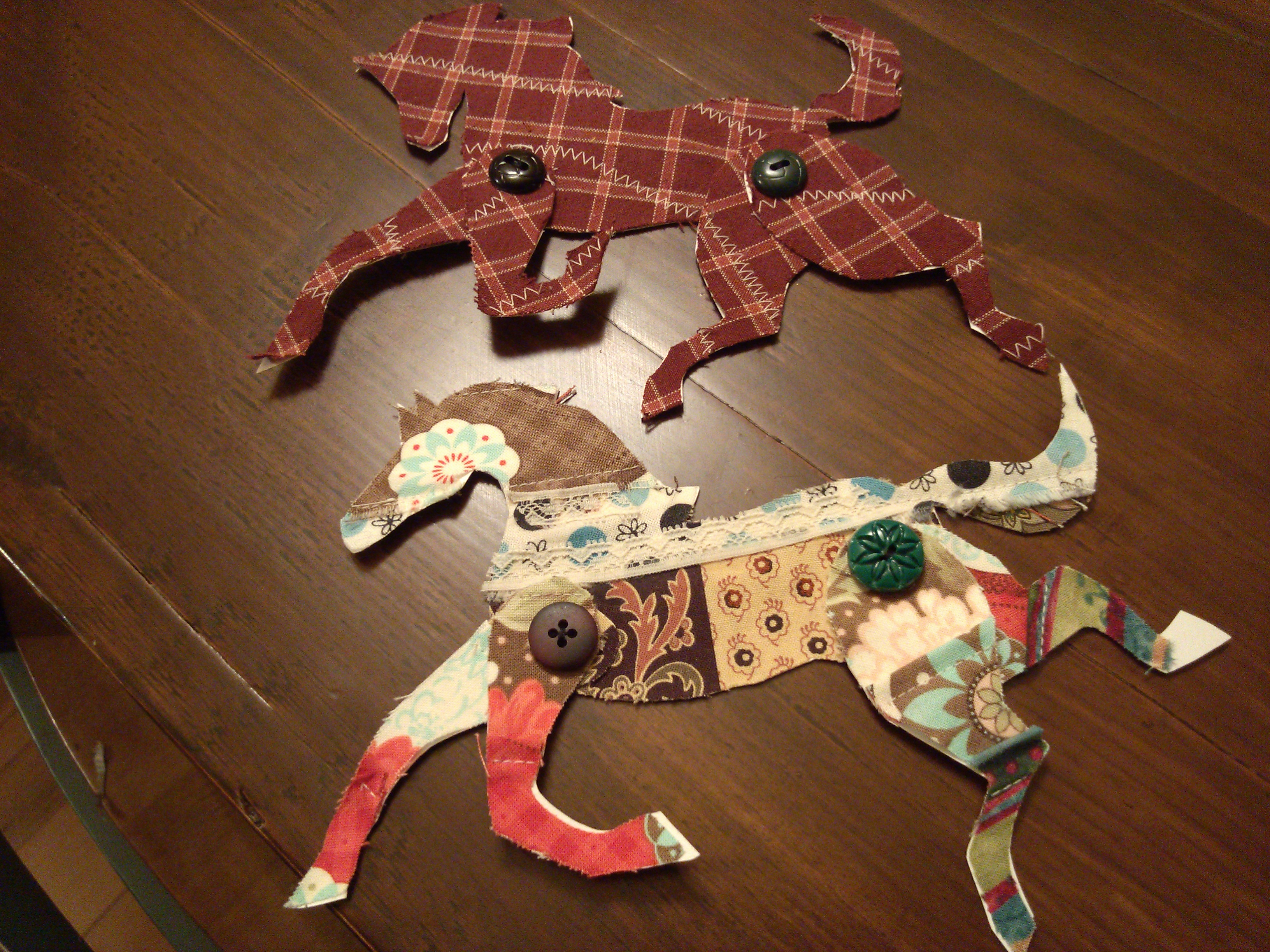 These horses (template by Ann Wood) have several friends in various shades and textures. I’m in love with them – and they will comprise a collage for my niece’s 2nd birthday. She is learning about horse riding right now – and I hope these brings some cheery dreams of riding to her bedroom wall! Finished piece by next week.