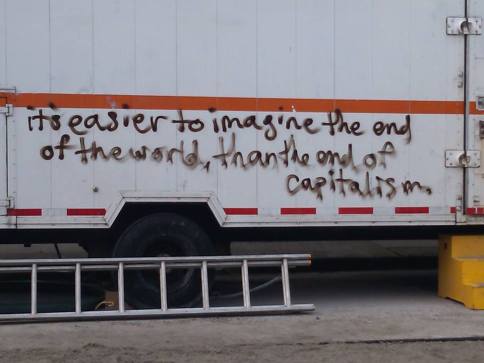 This graffiti makes me think of lots of people I have known and things I have done — which I realize now weren’t weren’t in the service of ending capitalism but of ending my own sense of suffering. I think to be honest the graffiti would actually read “it’s easier to imagine the end of the world, than the end of suffering.” This explains a lot of apocalyptic thinking (and action) on the left and right – call it whatever you want (capitalism/oppression/suffering/guilt) we are all looking for a way out. For some of us the suffering is so extreme that we can only imagine it ending if everything ends with it (and if you are a Christian – you might not be so sure about that because hell is always a potential afterwards).