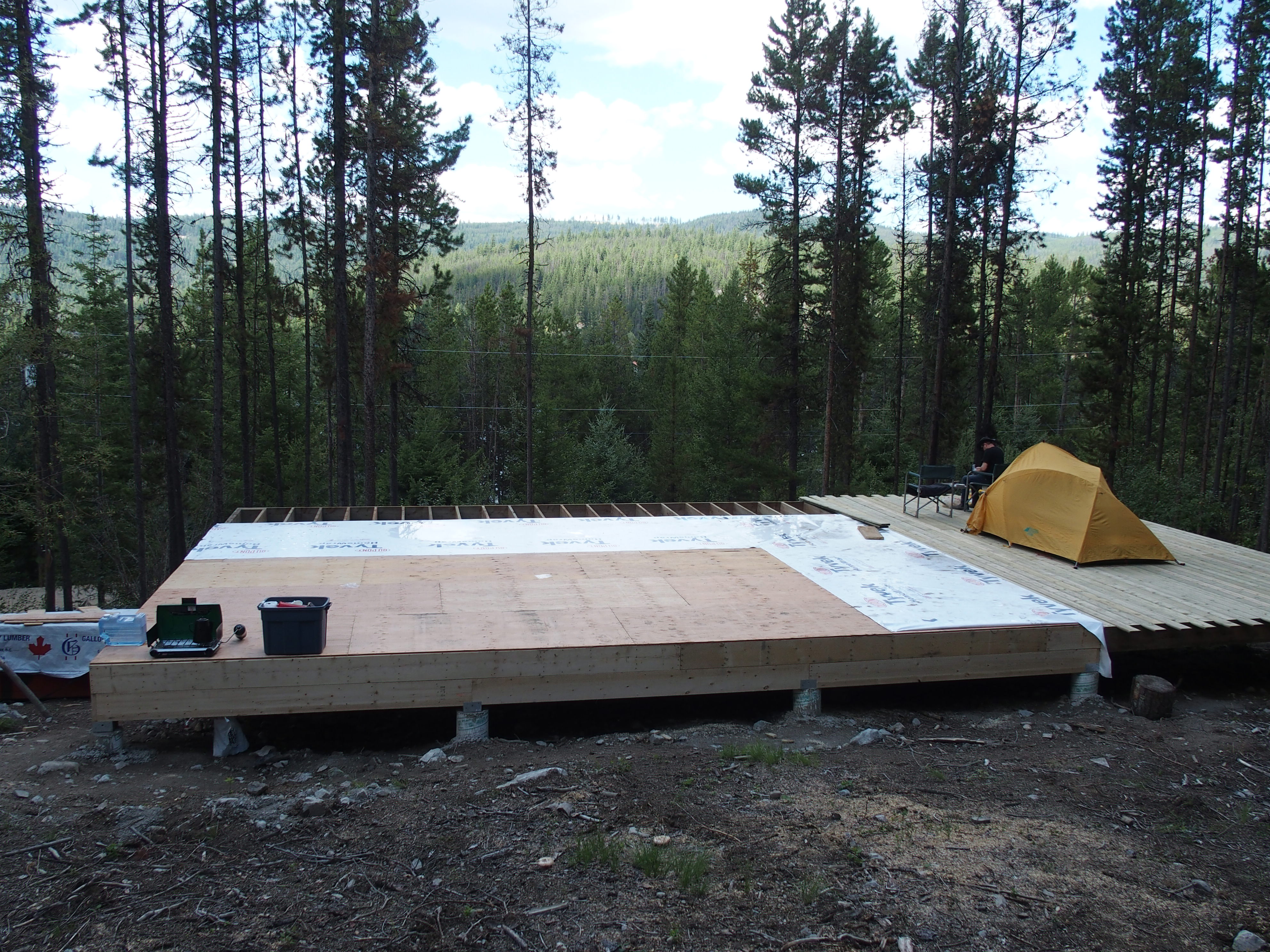 After work on Friday we drove to our place at Link Lake to camp for the weekend. We didn’t know how far along the building of the cabin had progressed (if at all) because while our builder is great at building, he is terrible at communicating. So terrible that he had our building permit in hand for a whole week before he dropped us a line to let us know. Fortunately we hit the road early enough to get to our property before nightfall and were ecstatic to see that construction has started and the foundation, cabin platform and deck are done already.