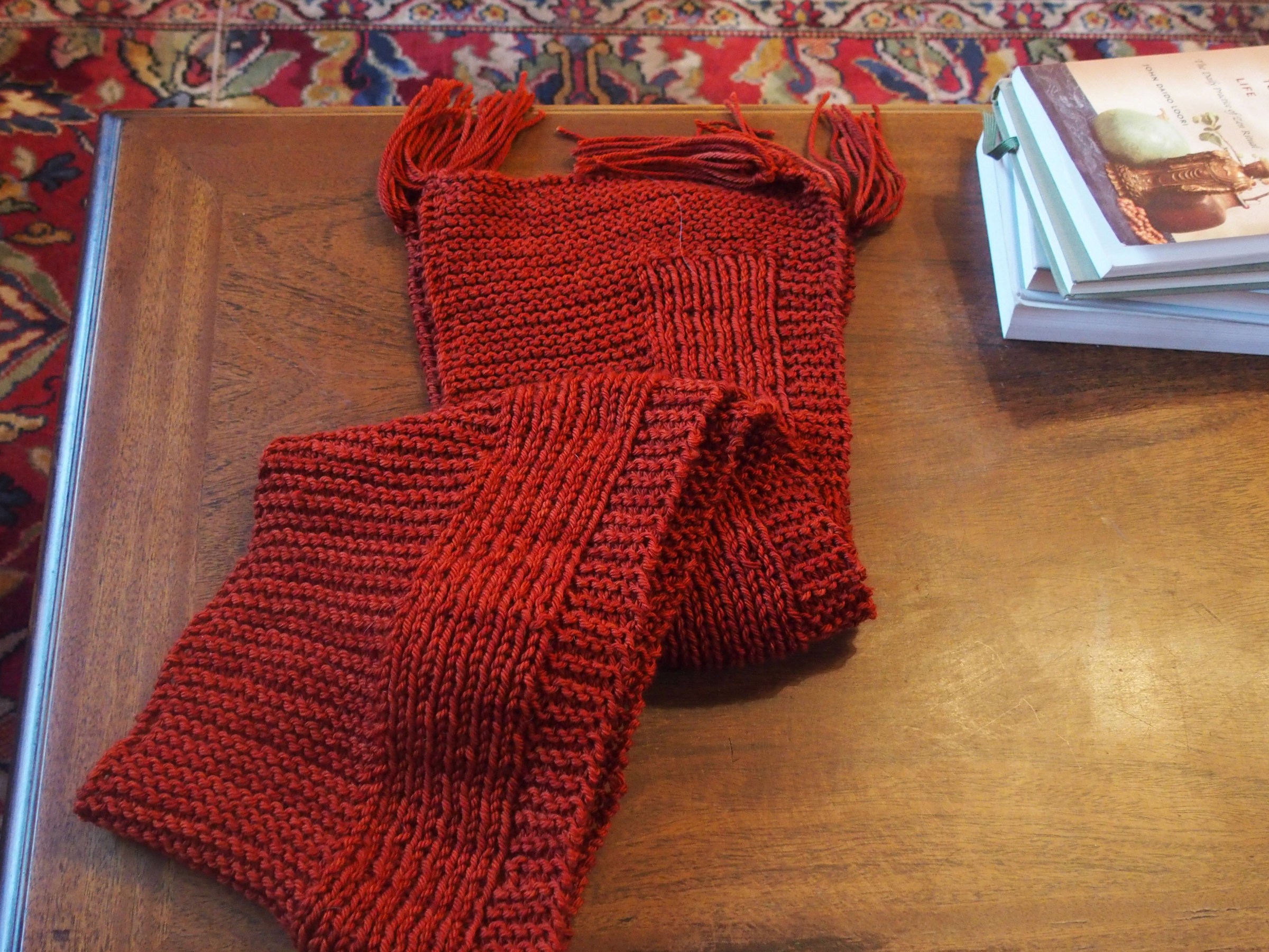 Yes, it’s my third finished project posted this week. But this one is exciting because it’s my first, honest-to-gosh, finished knitting project. A scarf! (Pattern is Wheat by Tin Can Knits – thanks folks for the super-easy and free beginner pattern that still has some interest to it). I added some fringe and I entered it into a knit-along that Sweet Georgia Yarns is hosting for the summer. Added bonus? I knitted it almost all in one weekend while visiting the family *and* it has very few mistakes.