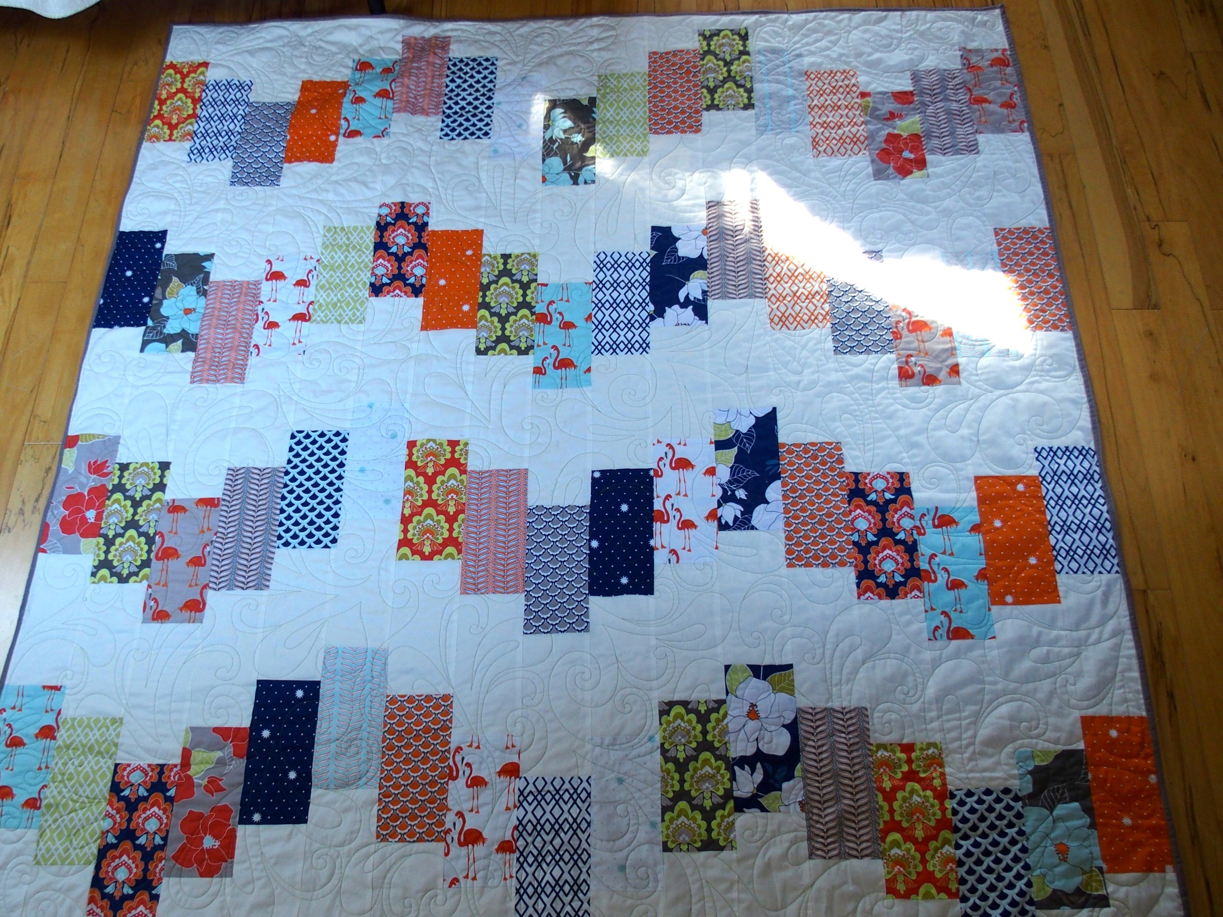 A bit of a drive-by posting this morning to simply show off the quilt that I finished yesterday, just in time for M’s first day of school. She moved into her dorm room last Wednesday, so I’m a little late on the draw, but my sewing room was pulled apart until yesterday so it was all I could do to finish. This is a very straight forward quilt pattern, one that I have now made twice because the ease of putting it together using pre-cut fabrics makes it a perfect gift item (From the book 25 Ways to Sew Jelly Rolls, Layers Cakes and Charm Packs). The quilting on this is by Terry at 6 Ave Quilting – who does great work for a very competitive price.