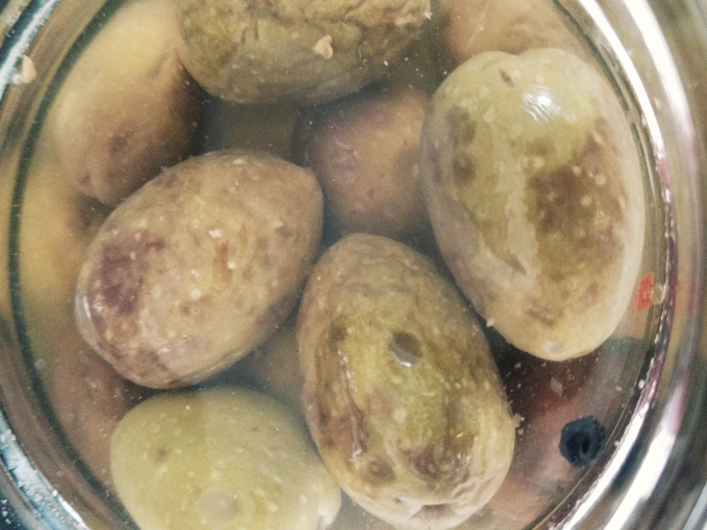 One way that you prep olives for water-curing is by cracking them with a back of a spoon – you don’t want the pits to come loose, by you do want to create a split in the fruit so the water can do its work. We transferred these olives from the water to a herb-brine at the end of October and started eating these about two weeks ago. Here is what my cracked olives look like now, two and a half months after I started the process: