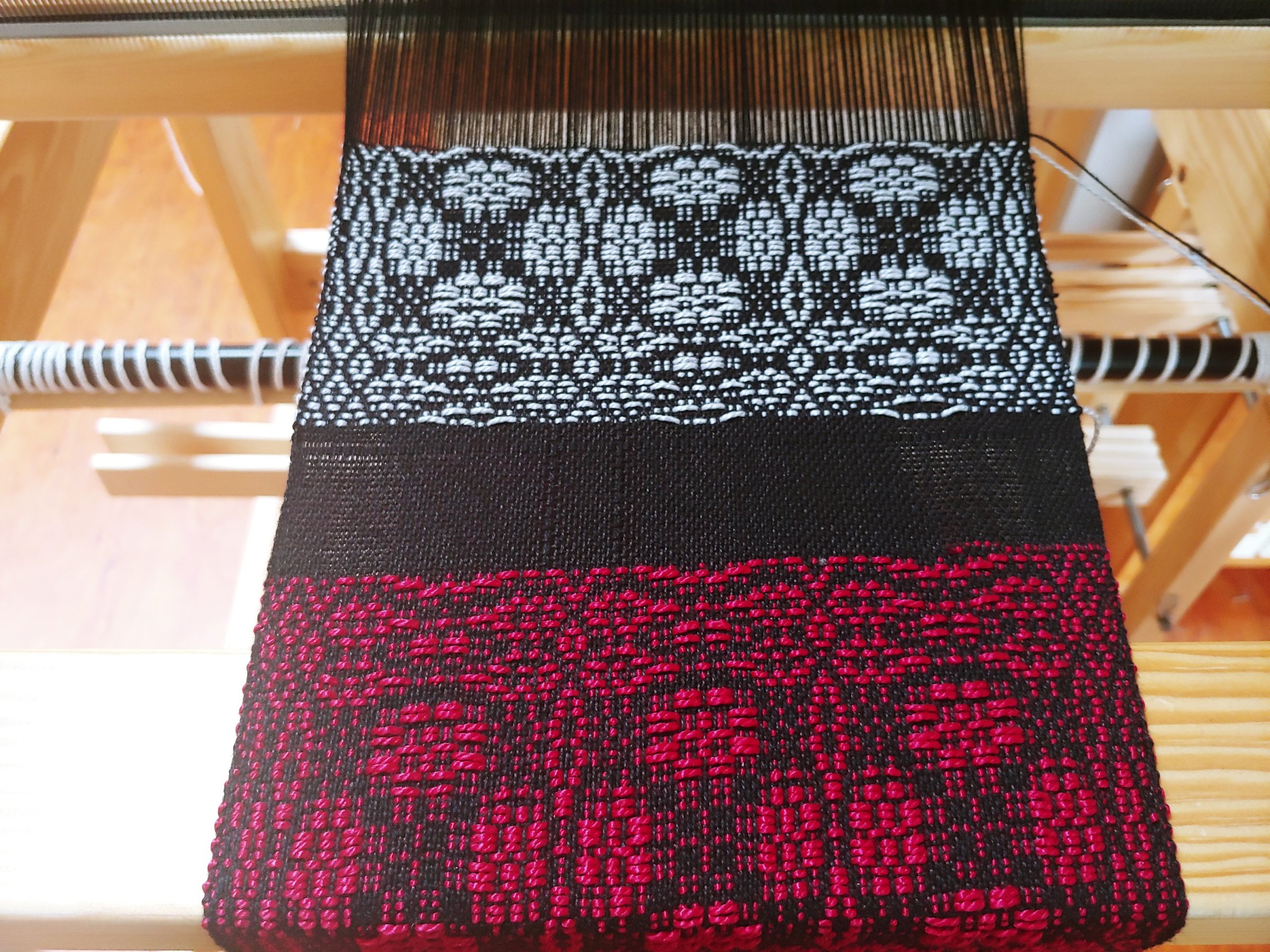 This is overshot, a weave structure I have long been fascinated with but thought would be a bit complicated to weave as it requires two shuttles. Since the whole purpose of sampling is to learn new things, I decided to start with something that really caught my eye and have really felt rewarded by my choice. While it has taken me a bit to really get in a rhythm, I am finally there and confident that if I did warp the loom to make a scarf, I’d get into the flow and be able to get it done without getting bogged down. While it’s tempting to do that, I’m going to be moving onto my next sample shortly in preparation for making a wool blanket.