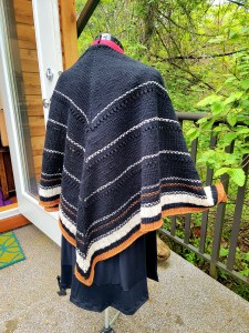 I have been weaving a lot this week, with a cotton-linen warp on my loom I am just now weaving off the last of four hand towels for the bathroom. I also finished knitting a shawl that I started six weeks ago, and it is packaged up to go out as a gift later today. I had not planned it as a gift when I started it, but for reasons related to the timing, it become apparent to me that it was meant for someone else. Still, when I put it on yesterday after blocking, it was hard to take it off and fold it up in the bag to go out. That likely means I’ll be making another one in slightly different colours. This is a pattern by Isabell Kraemer – whose knit designs I adore.