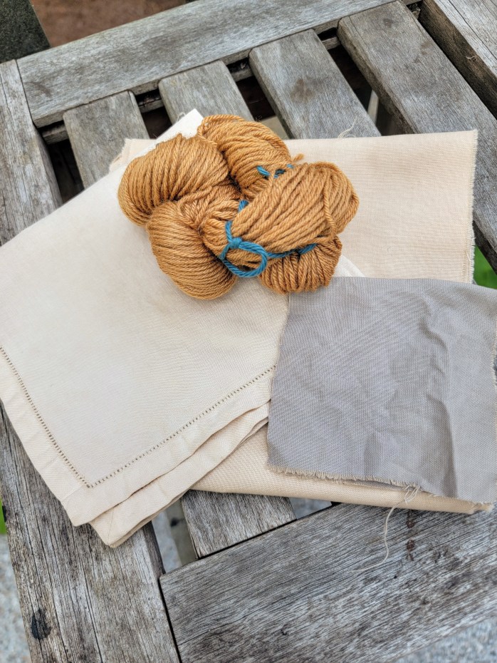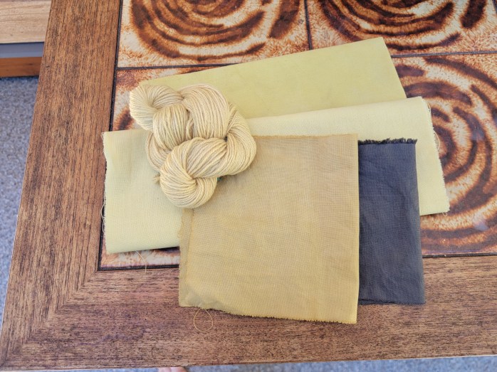 Dyed at 25% WOF using extract. Top to bottom: Cotton mordanted with alum acetate, cotton mordanted with alum, soda ash rinse (golden sample), shifted with iron @4% (brown-grey). I plan to overdye most of this with Indigo to get teal. We’ll see how that goes.