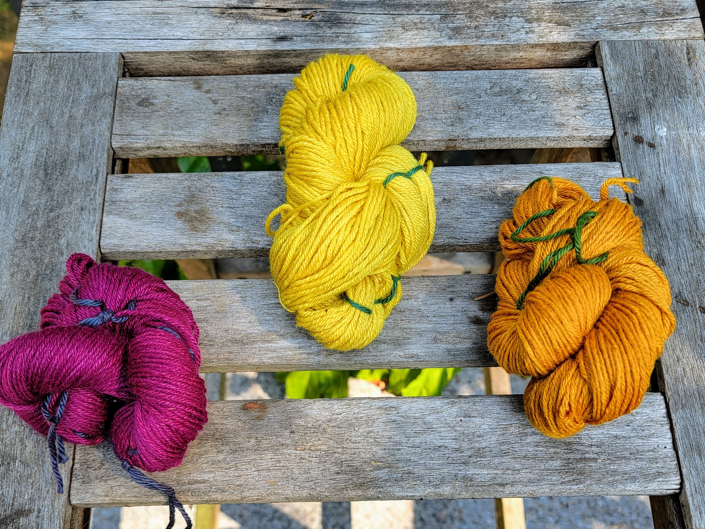 Summer Textile School is fully in swing! I’m glad my dye studio is outdoors so that during the hot, hot heat I was able to keep dyeing without warming up the house. I’ve come to realize that before I can seriously dye some yardage or larger skeins of yarn I’m going to have to come to the end of this experimental phase – but I’m enjoying it so much! I have some more yarn to turn into small skeins and then once that is done I’ll have to cut myself off and get on with the yardage dyeing.