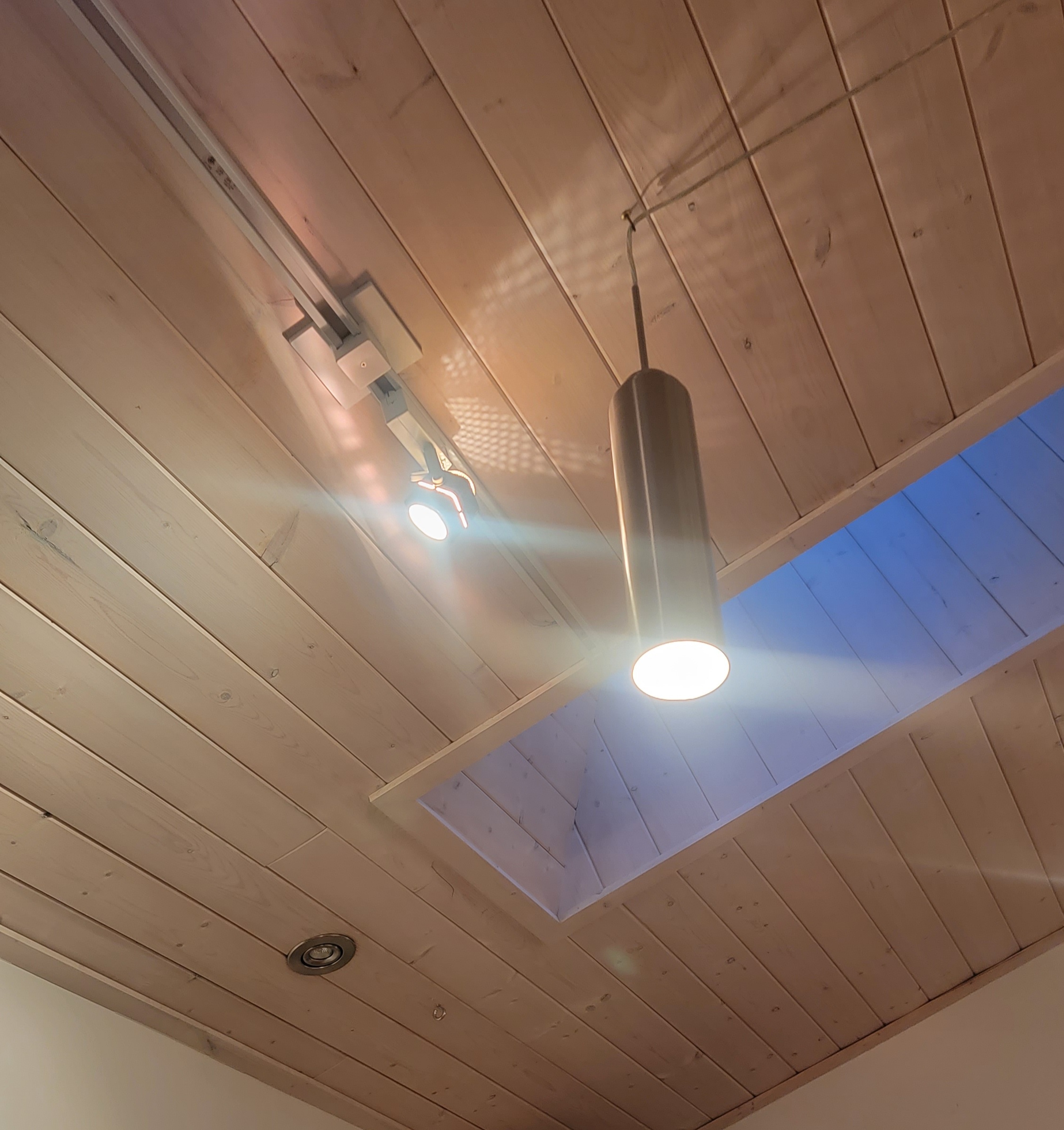 Since we moved into our house on Gabriola just over five years ago, the lighting in my studio has been somewhat of a toleration, though I only recently identified why that was so (and what effect it was having). I am lucky to have a studio with 14-foot ceilings and lots of windows. When I first moved into this space, the layout and the track lighting gave me the impression that the studio was “well-lit”, even though I did notice that the track heads were grouped oddly and pointed to light certain areas of the studio and not others. Besides the track lights, there is one other pendant fixture that gives off almost no light at all and is positioned in a strange and un-aesthetic place. I gave this zero thought when I moved into though, setting up a few task-lights to make up some of the light-deficiency in the dark corners.