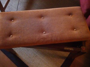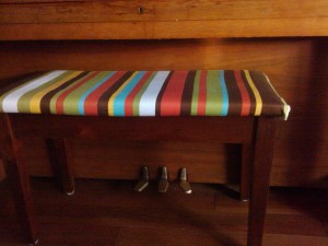 Just as an aside, the above pillows match the redo that B. and I did for M’s piano bench as a Christmas gift. What looked like this: