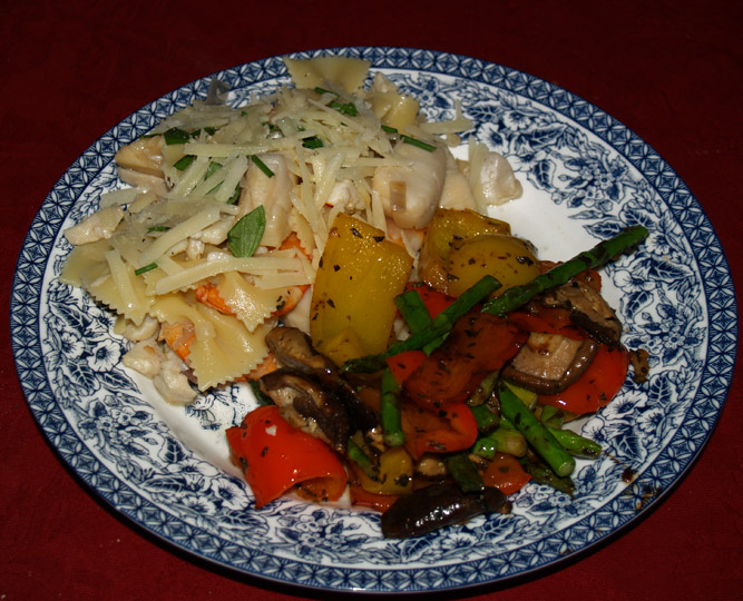 Using a slotted spon, dish onto two plates, top with sliced fresh basil, chives and about a half an ounce of grated romano per meal. You will note that this is mostly seafood and only a little pasta which is the way it should be. A very generous meal for two people, it could easily be for three with the addition of a little more pasta.