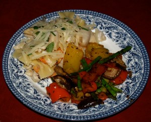 Putting this together is really very simple. Make sure the fish is all cut to around the same size because it will be cooked together. Sautee the minced garlic and shallots in lots of olive oil, a little salt and throw in a little dried herb (oregano, basil, whatever you like). When the garlic and shallots are nicely cooked, splash a little white wine in the pan and let it evaporate before adding more oil, and the cut up fish/scallops/prawns. Splash the cooking fish with more wine, the juice of a whole lemon and a little salt before putting the lid on the sautee pan for a couple of minutes. There will be about an inch of liquid in the bottom of the pan at this point – all wine and oil. Don’t leave this too long or the fish will fall apart – it only takes about 5 minutes to cook the whole thing. When the cooking is done, squeeze another whole lemon on the top and add the cooked farfalle to the skillet (I use a heavy cast-iron frying pan for most things). Stir it up until everything is mixed well.