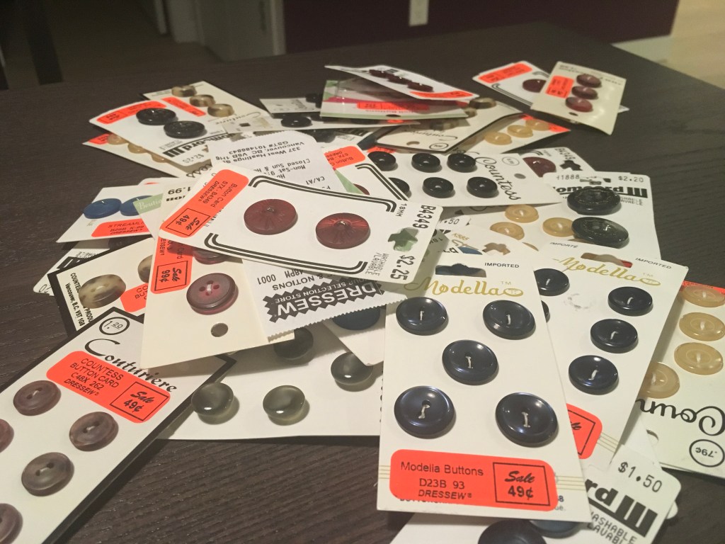 As the day closed, there was another torrential downpour and even some crazy flash flooding on the street, but I left (with my giant float plane company umbrella) and went to DressSew to buy buttons. If you sew you know that buttons are pretty expensive, but at DressSew they carry buttons that were discontinued decades ago at a ridiculously reduced rate. I bought $25 worth of fabulous buttons for .49 or .25 cents per card.