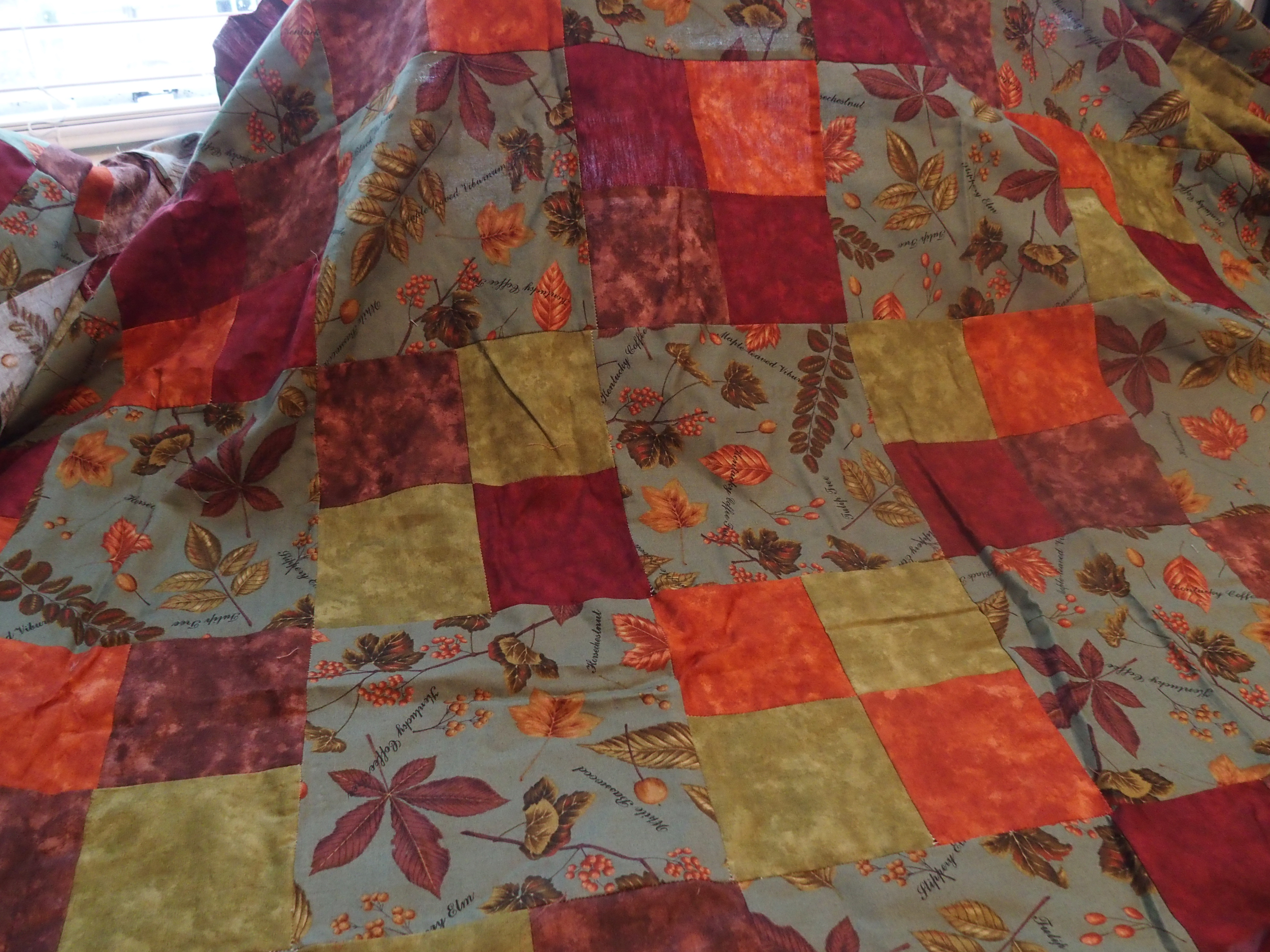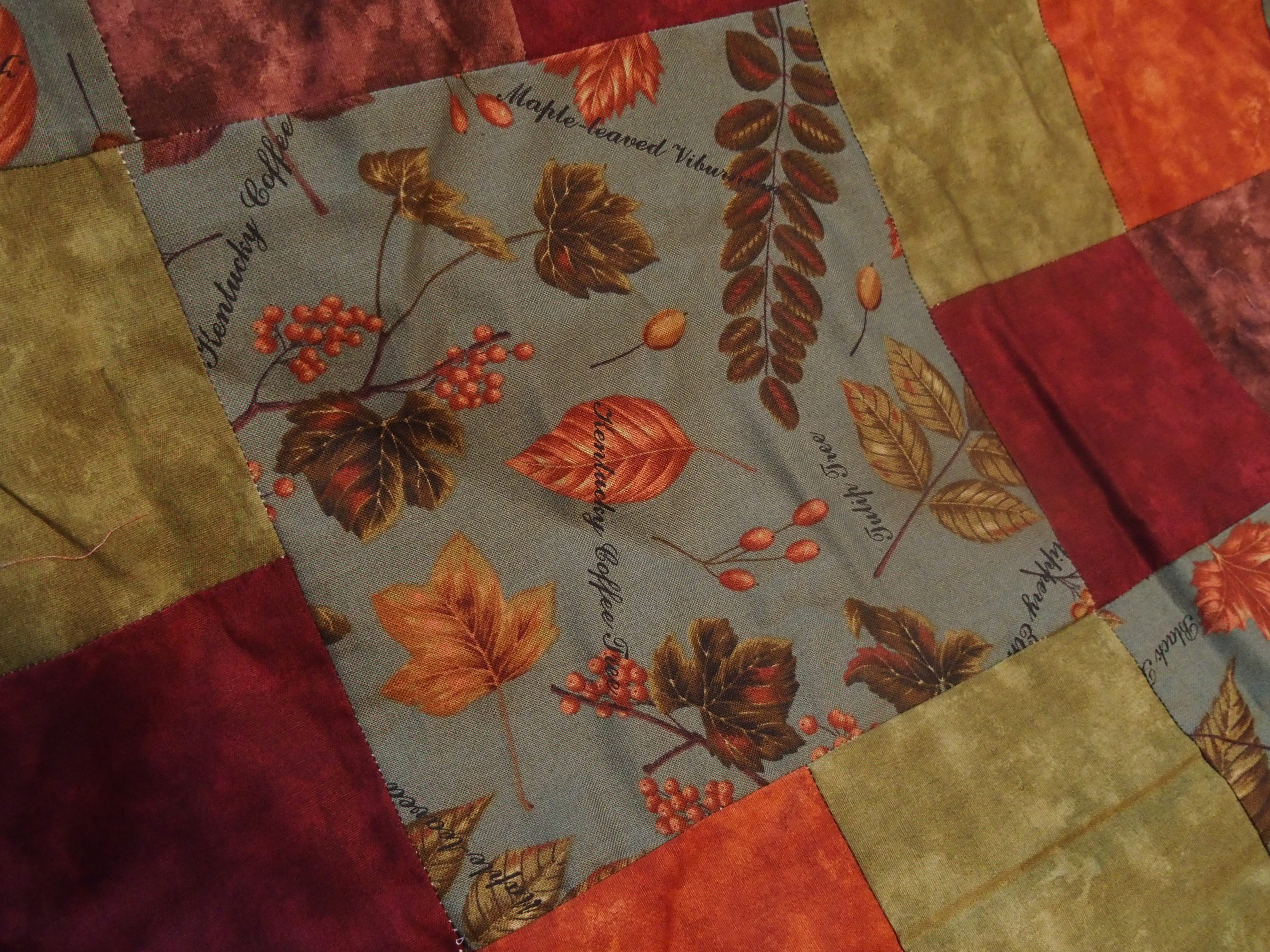 As I was very new to quilting and possess no colour-theory background, I didn’t stop to think of the tone-value of the batiks I chose to go alongside the leaf-print…. which as you can see are much brighter. Thus my quilt is dominated by bright olive green and bright rust orange rather than the lovely muted fabric I fell in love with.